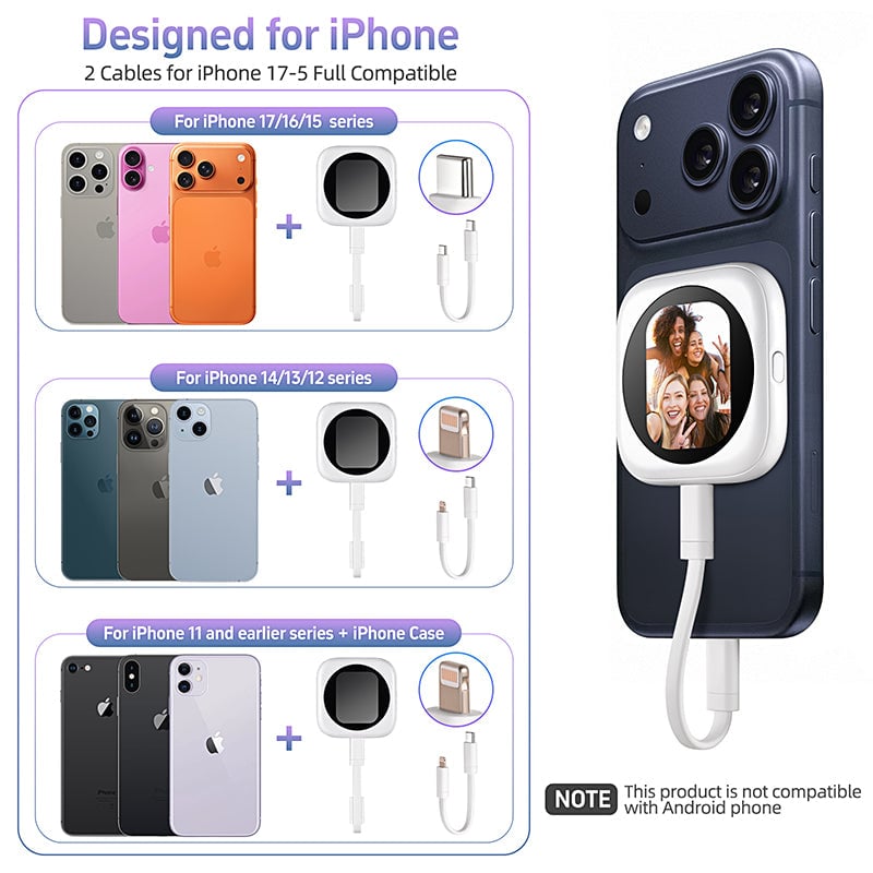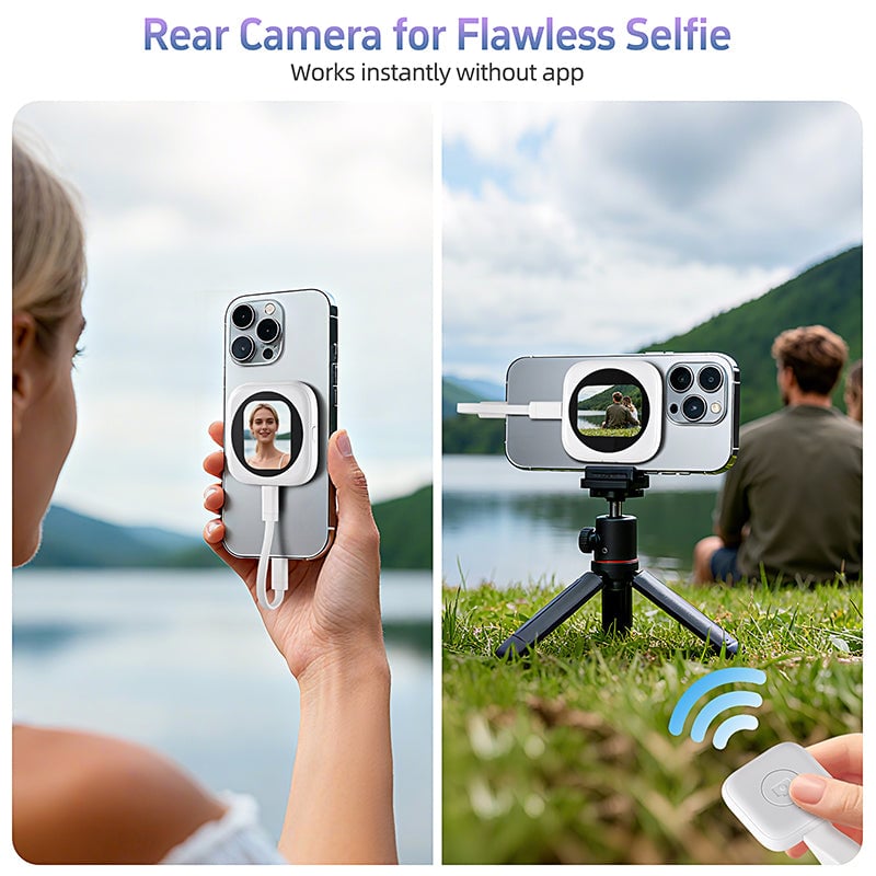 - Battery-free, ultra-portable design: Powered directly by your iPhone, this selfie monitor screen runs as long as your iPhone does. Lightweight and compact, it slips easily into your pocket or camera bag—ready for filming on the move, city walks, or family gatherings.