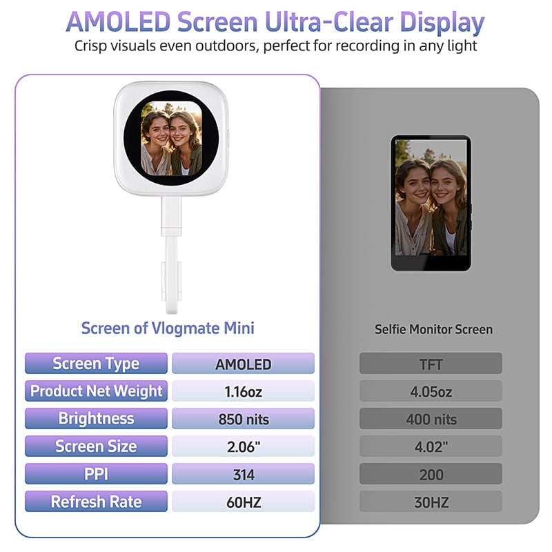 - Outdoor-ready ultra-clear display: This compact selfie monitor screen iPhone features a 700-nit ultra-bright AMOLED display, delivering clear, vivid previews even under bright sunlight. With 320 PPI pixel density, every detail stays crisp—ideal for travel videos or everyday shooting.