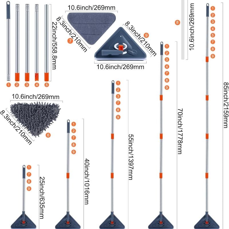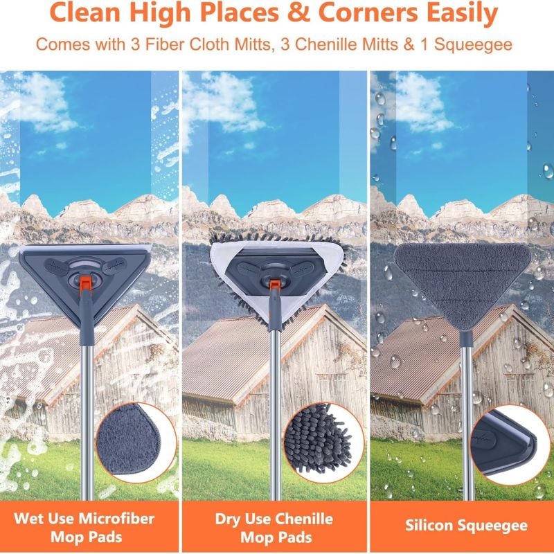 • 360° Swivel Head Design: The triangular mop head can be adjusted to any angle you want to better clean dead corners and hard-to-reach areas. In addition, you can secure the triangular mop head with the locking function so that it does not collapse or flip when sweeping high.