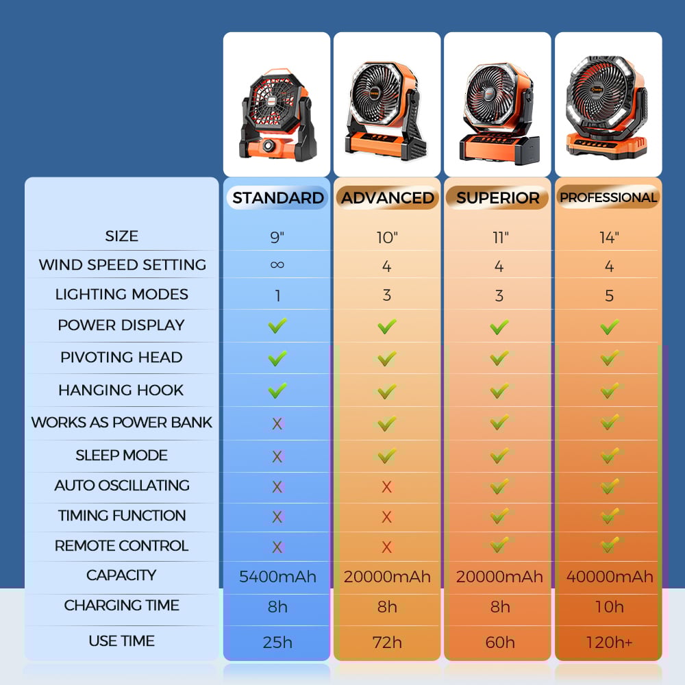 Multiple Battery Capacity Options: Choose from three battery capacity options - 5400mAh, 20000mAh, and 40000mAh - to enjoy extended battery life and longer-lasting cooling relief during your camping trips or outdoor adventures.