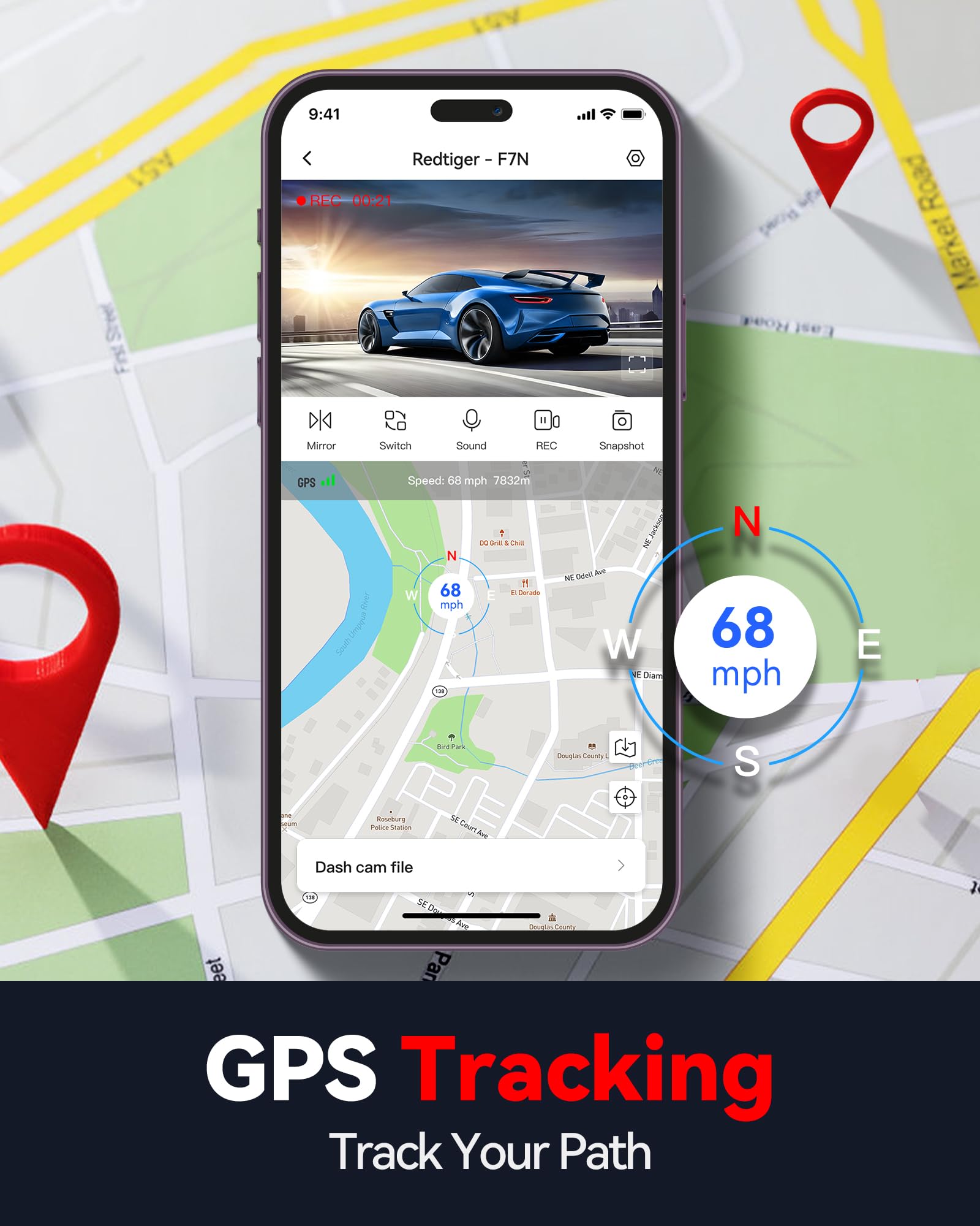 • Gps & wi-fi: The Built-In GPS Module Enables The Front And Rear Dash Cam To Precisely Pinpoint The Vehicle’s Location, Routes And Speed In The Recordings Via The App And GPS Player On Your Smart Device. Connecting To Your Mobile Devices Through The Dashcam's Built-In Wi-Fi, Enjoy Wireless Data Transfer, Change Settings, Easily Control The Cam, View, Download And Share The Videos.
