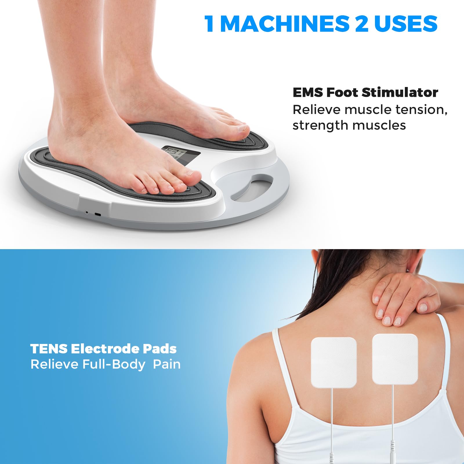 Two effective uses: This multifunctional foot massager combines TENS electrode pads and an EMS foot stimulator to deliver full-body pain relief and targeted muscle therapy. Use the TENS pads to ease tension in the neck, shoulders, back, and more, while the EMS foot base promotes circulation, relieves muscle tightness, and helps strengthen lower leg muscles. One compact machine, two effective uses—ideal for comprehensive relaxation and daily recovery.