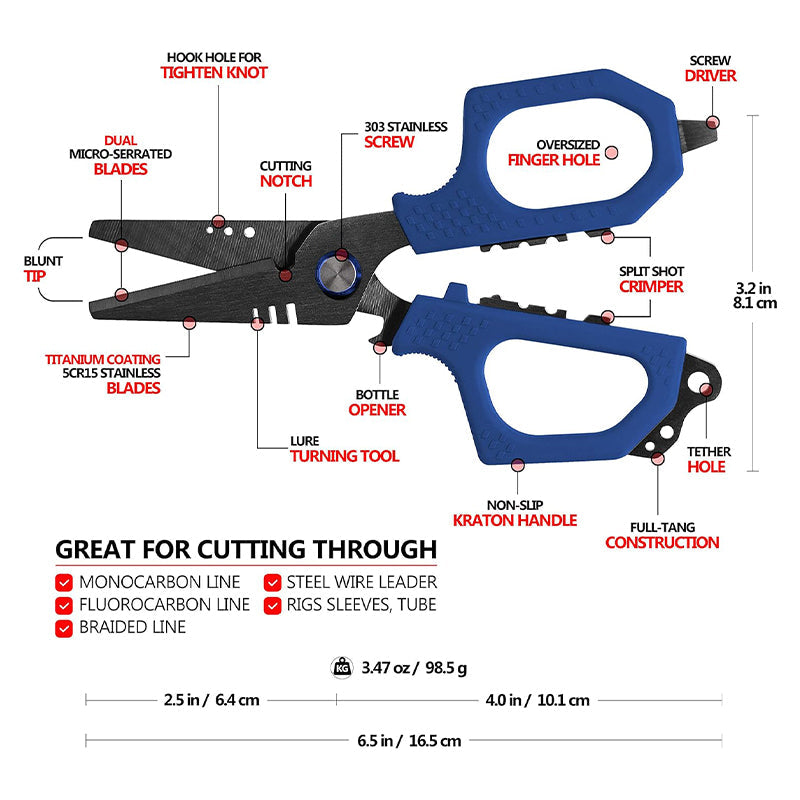 • Multi-functional: Braided line snips, tube cutter, split shot crimper, power notch, tune baits, tighten knots, bottle opener and lanyard hole to secure.