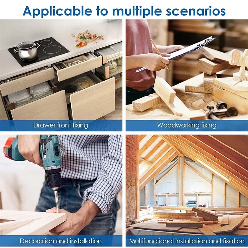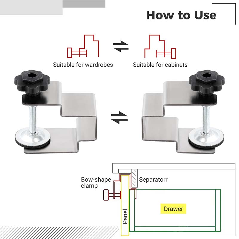 The drawer front installation clamps, designed to help you effortlessly install perfectly aligned front drawer panels.The clamps, usable at both ends, cater to both wardrobes and cabinets.Besides, their bow-shaped structure ingeniously avoids partitions and fixes panels, guiding you to accurately complete tasks.