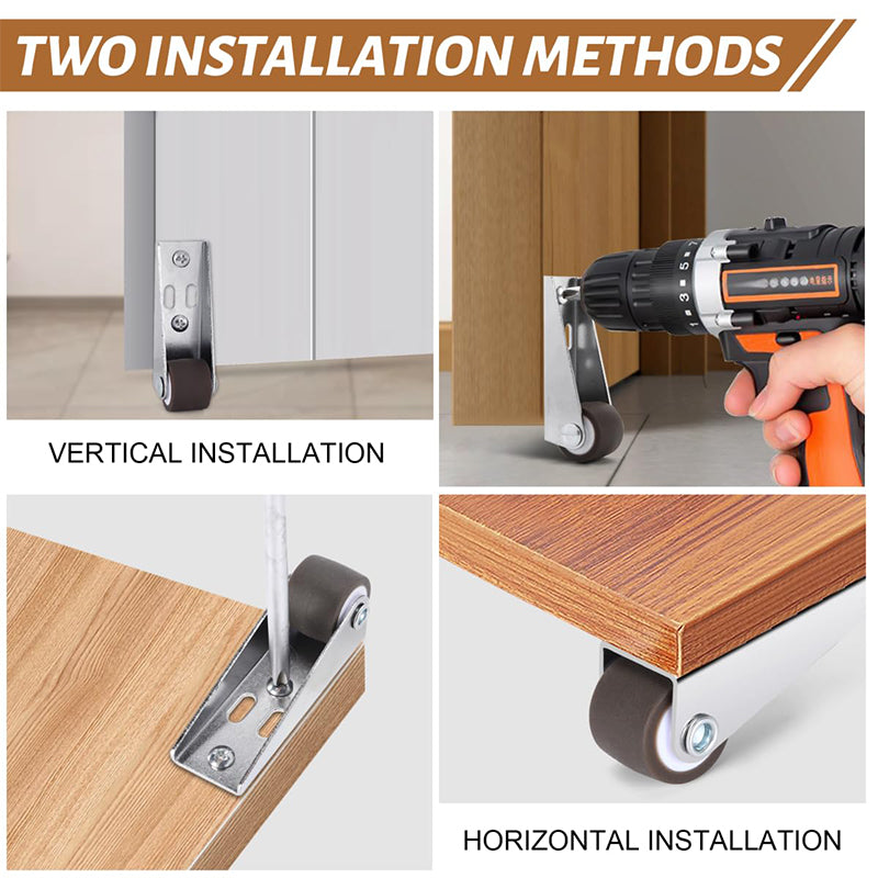 • Two installation methods: Long-frame rigid casters can be installed vertically or horizontally: Small casters can be utilized as side mount casters to be installed on the sides of furniture, or as plate casters to be installed at the bottom of furniture. You can flexibly employ our casters in accordance with the height and width of the space.