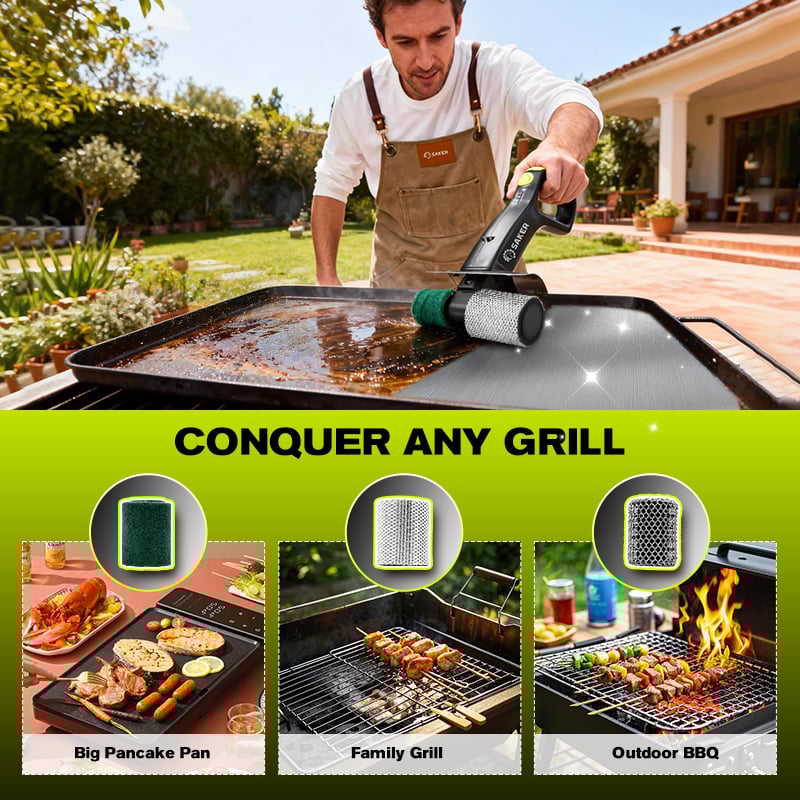 • 3-in-1 interchangeable head system: Tackle any cleaning challenge with our versatile system. Easily switch between the stainless steel chain roller for heavy-duty char, steel wool for general scrubbing, and a soft velvet pad for delicate surfaces. This makes our grill cleaning kit the most adaptable grill accessories for outdoor grill.