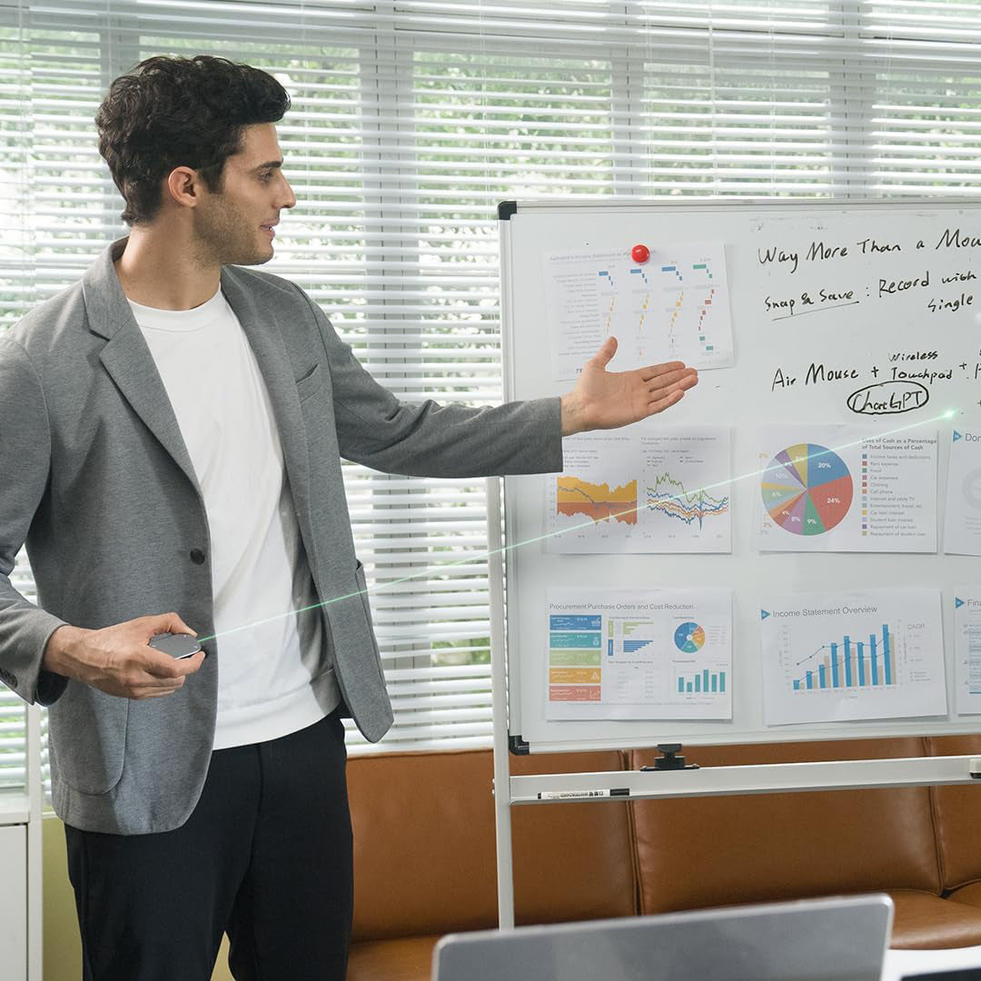 Ultimate presentation clicker with laser pointer: This air mouse is an ideal assistant to have in your meeting room, classroom, or lecture. It offers two modes of operation: desktop mode and air mode. In desktop mode, it serves as a regular air mouse with added touchpad features. In air mode, it transforms into a handheld smart device controller and professional presentation remote clicker with two content highlighting options.