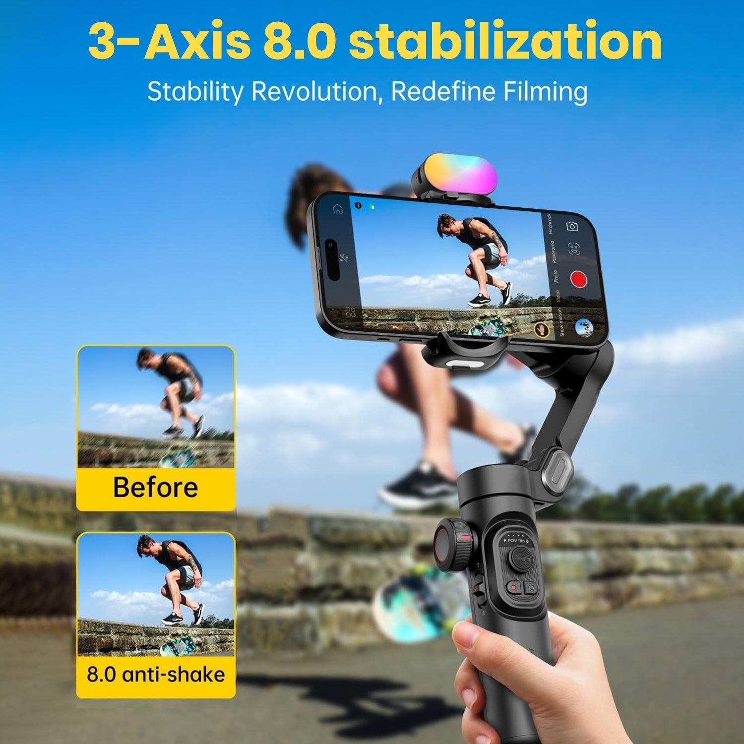 • Intelligent 8.0 Anti-Shake Technology: Our phone stabilizer uses advanced 8.0 anti-shake technology to ensure professional-level performance, effectively eliminating blurriness caused by movement. Your photos and videos remain clear and stable, capturing every moment with precision. Whether shooting in motion or capturing stills, the stabilizer provides excellent stability and performance. In addition, the stabilizer comes equipped with a professional focus wheel and zoom slider for real-time, precise adjustments.