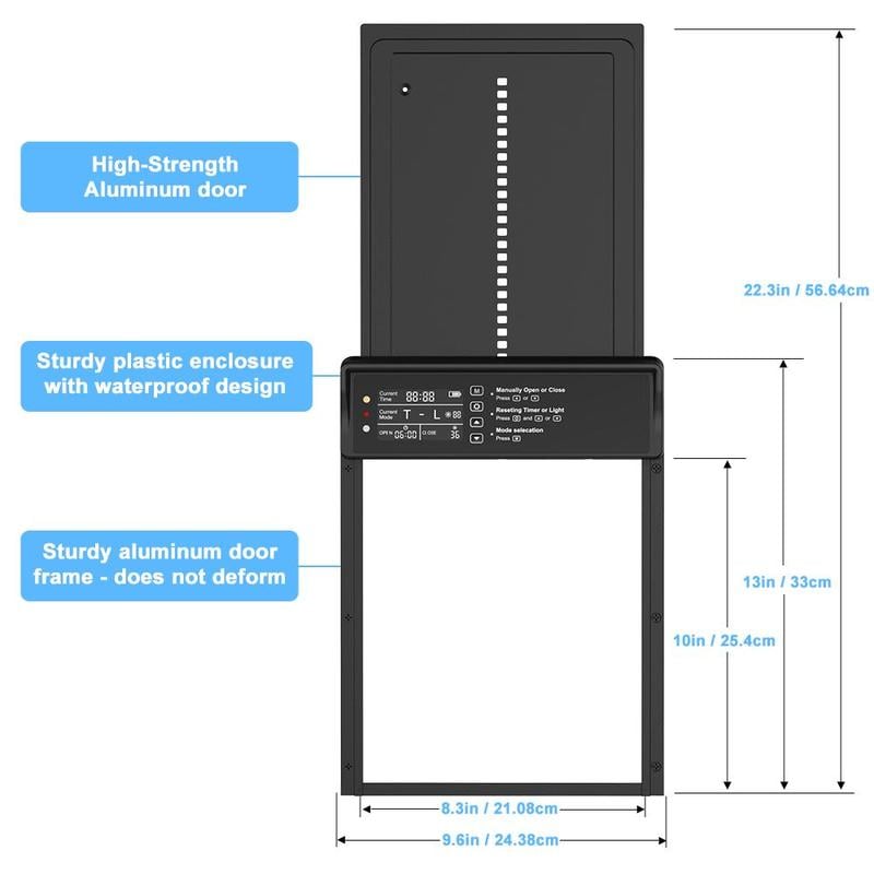 High-strength aluminum door frame: Made of high-strength aluminum alloy, the door frame is sturdy, durable, and resistant to deformation, ensuring long-term stability and suitability for various climate conditions. Equipped with a waterproof plastic enclosure, it effectively prevents rainwater infiltration, protecting the internal mechanical structure and extending the product's lifespan. Available in multiple sizes, it meets the needs of different chicken coops and ensures easy installation.