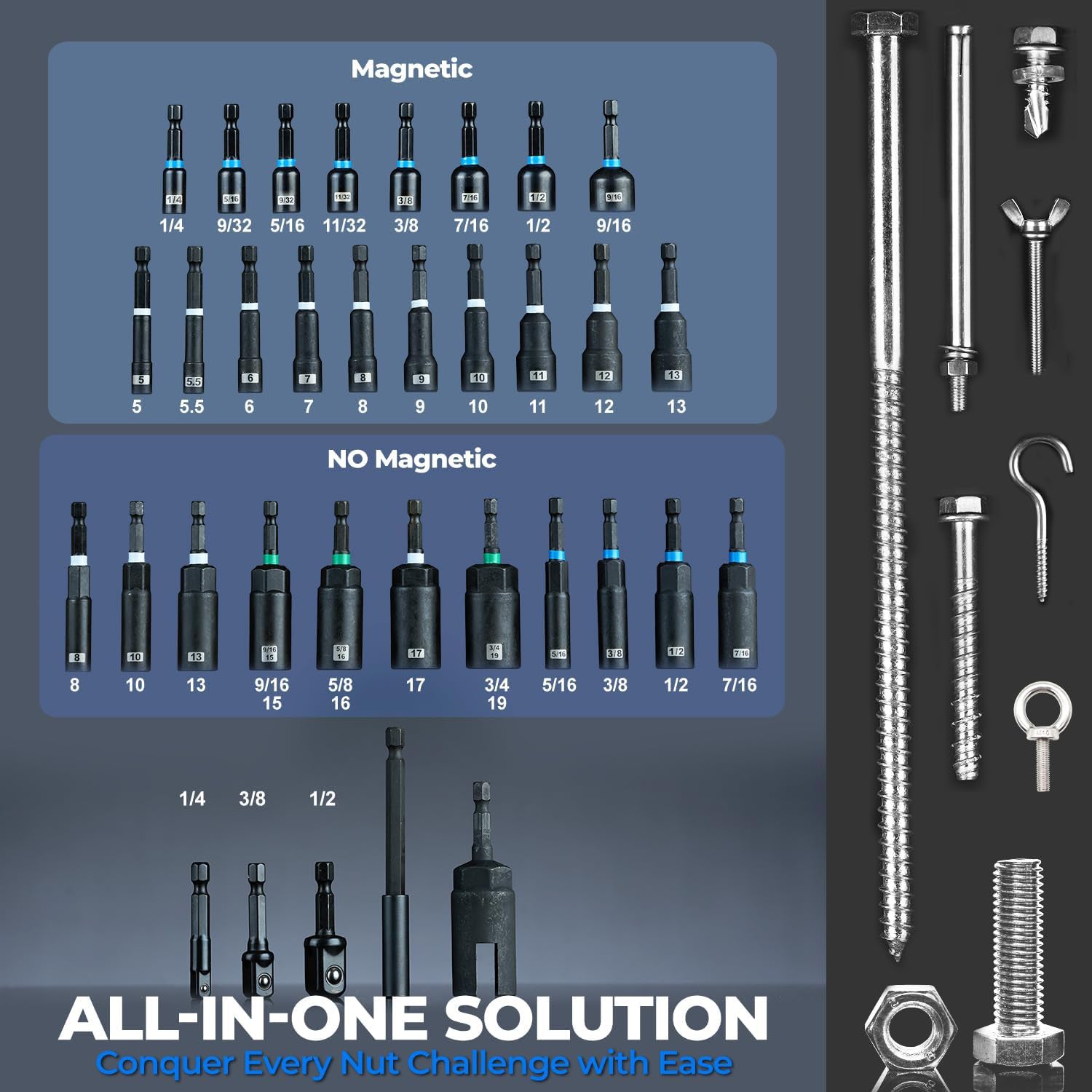 • All in one solution: Conquer every nut challenge with ease, this all-inclusive set includes metric/sae nut driver set (5~13mm,1/4~9/16''), deep nut driver set (1/4~3/4''), wing nut driver (17mm), impact socket adapters (1/4'', 3/8'', 1/2''), bit extension (6''). it's perfect for diy enthusiasts and professionals, elevate your toolbox and achieve exceptional results.