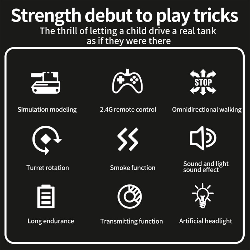 Durable and all-terrain capable: The tank is designed to conquer a variety of terrains such as high roads, sand, and meadows. It’s durable and ready for thrilling adventures, ensuring you can perform battle missions in different environments.