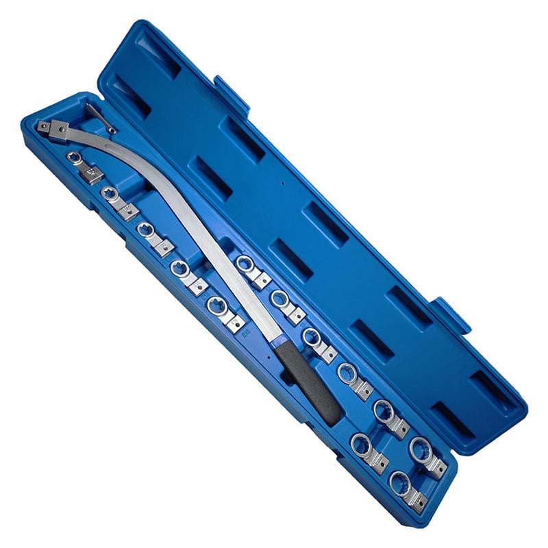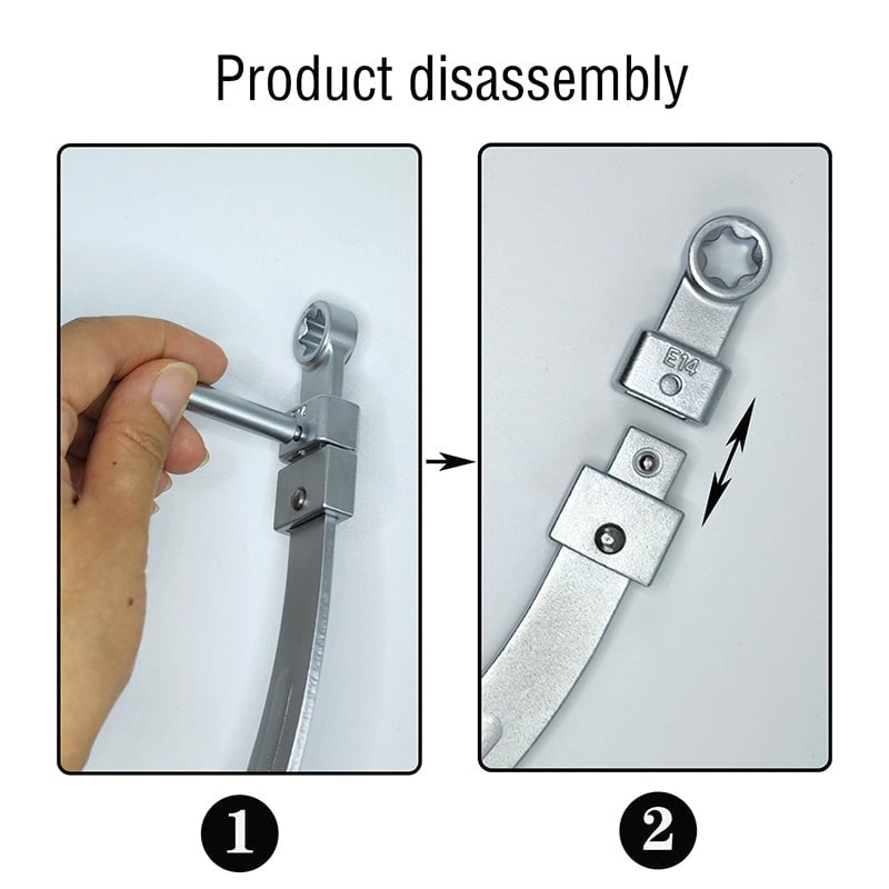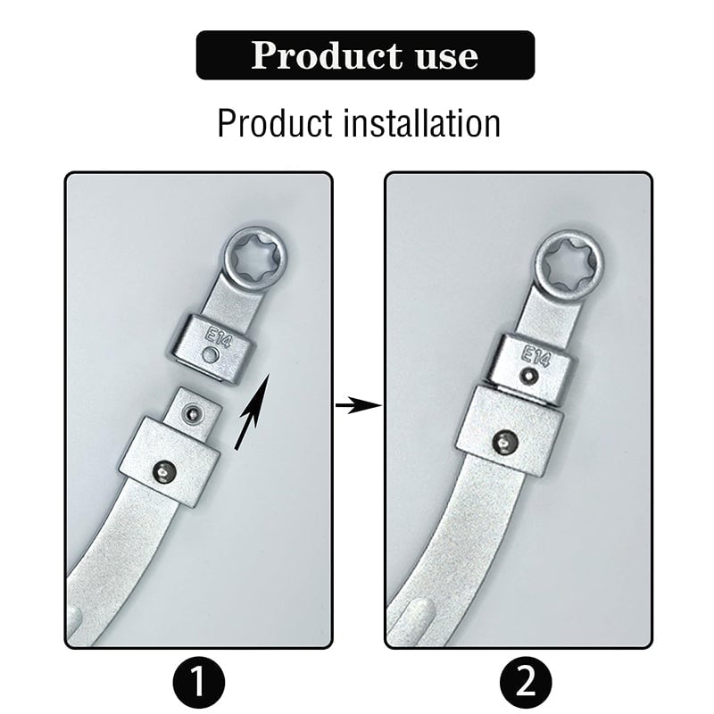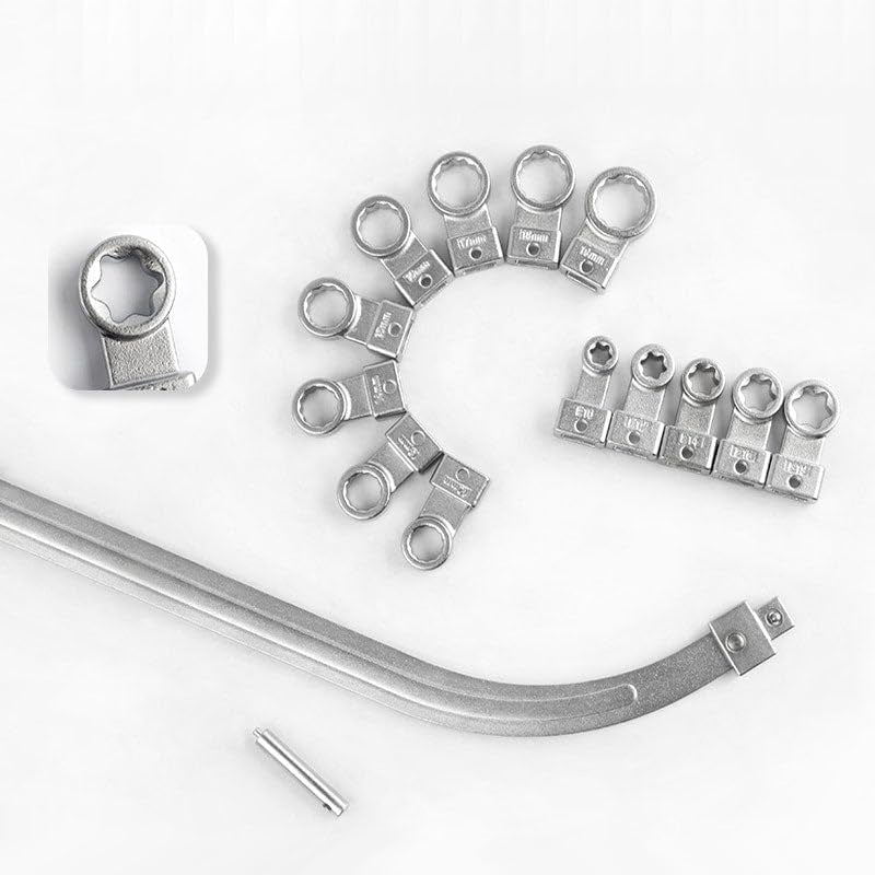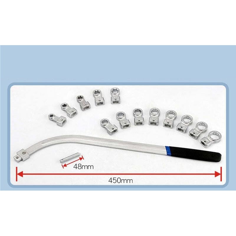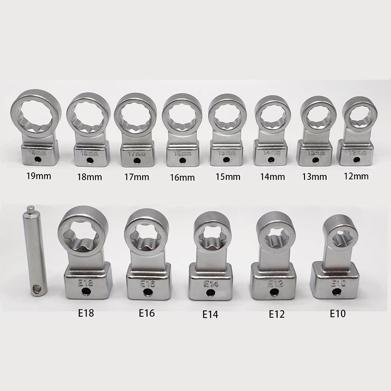 • Comprehensive set: The kit includes 1 long curved wrench, 5 Torx adapters (E10, E12, E14, E16, E18), and 8 12-point adapters (12mm, 13mm, 14mm, 15mm, 16mm, 17mm, 18mm, 19mm).