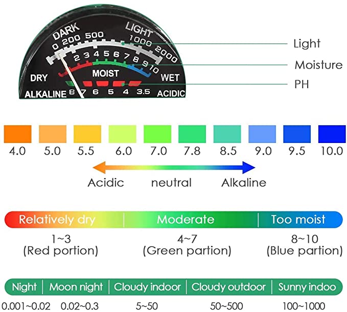 - 🌱【3-IN-1 FUNCTION】Test soil moisture, pH value and sunlight level of plant with our soil meter, helps you specialize in grasping when you need to water your plant.