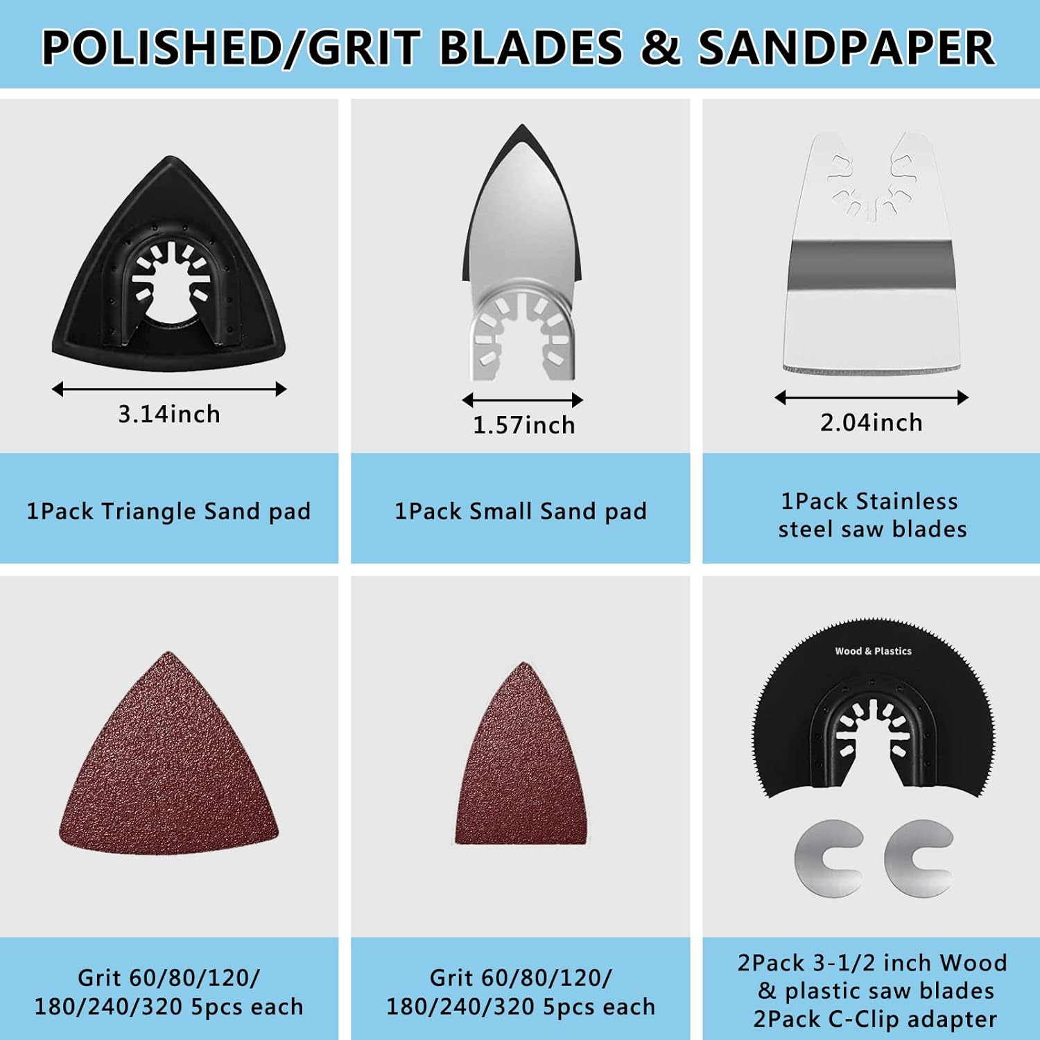 94 pcs oscillating multitool blades: A totally cost-effective tool set including 12 different types of blades for cutting wood/metal or grout removal, 2 sanding pads and 60 sandpapers. It can help you solve variety home repair or renovate work, perfect for wood/plastic/plaster/metal cutting and polishing.