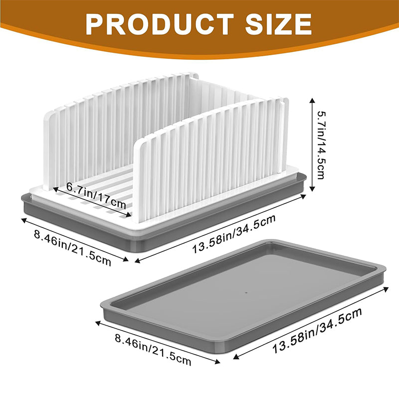 • Convenient Crumb Catching Tray: Featuring a multi-functional tray underneath, this bread slicer eliminates the countertop mess by catching crumbs and keeping surfaces clean. The lightweight tray is easy to clean and can also serve as a bread holder or dinner tray for gatherings and parties.