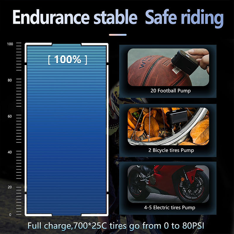- Long-Lasting Performance: Equipped with a high-capacity battery, our mini pump can inflate up to 2 tires to 100PSI on a single charge. This means you can tackle longer rides or multiple bikes without worrying about running out of air.