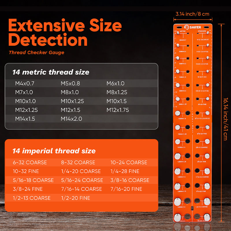- WIDE-RANGING SIZE DETECTION - Saker Nut and Bolt Thread Checker instantly identifies 28 distinct sizes, encompassing Metric thread sizes from M4 x 0.7 to M14 x 2.0, and Imperial threads from #6 - 32 Coarse to 1/2 - 20 Fine.