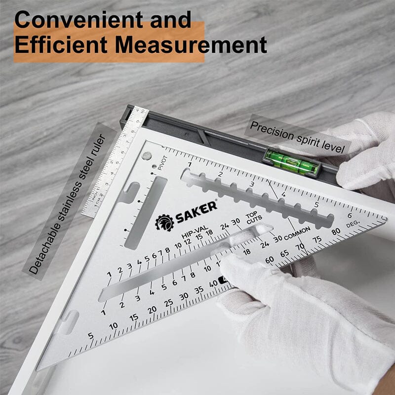Superior Quality: The SAKER® Rafter Square with Level is crafted from precise heavy-gauge aluminum alloy, ensuring durability, high hardness, and corrosion resistance. The square undergoes multiple polishing processes, resulting in a smooth surface that is gentle on the hands and makes it convenient to carry around.