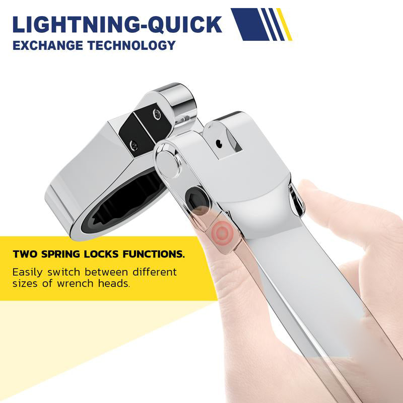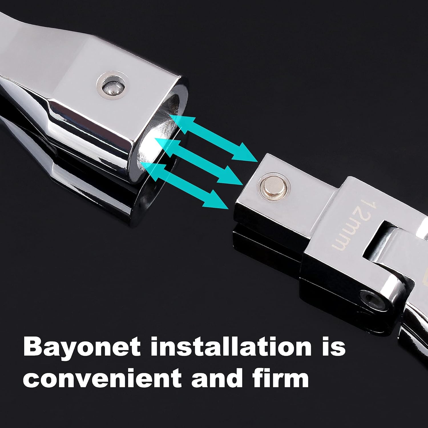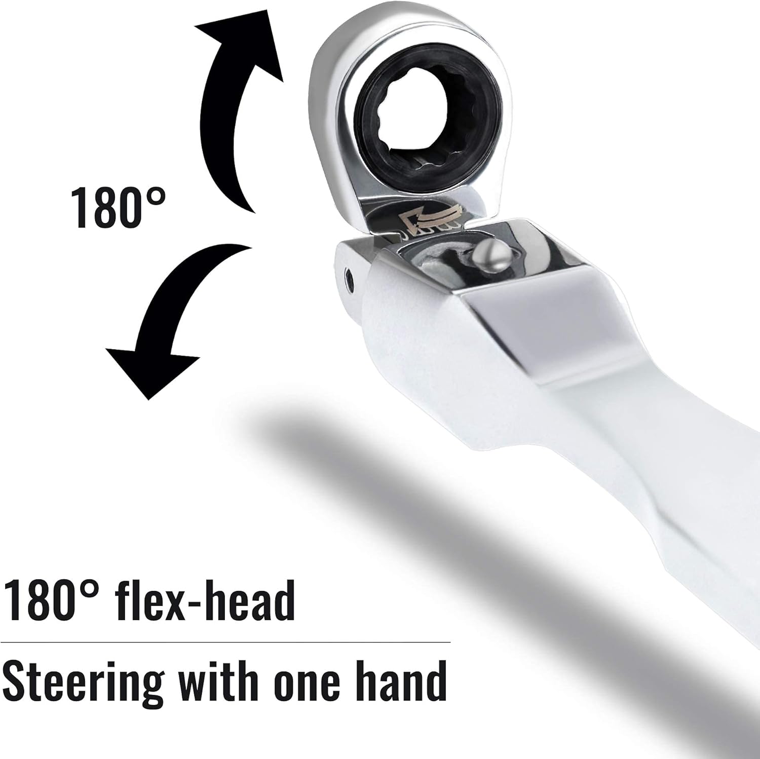 Flex-head ratcheting combination wrench adopting precise 72-tooth ratchet gears, Socket Sets Feature Quick Release, smoothly pivoting through 180 degrees, the heads hold any angle to slide onto fasteners,which is easier and more labor-saving than other wrenches