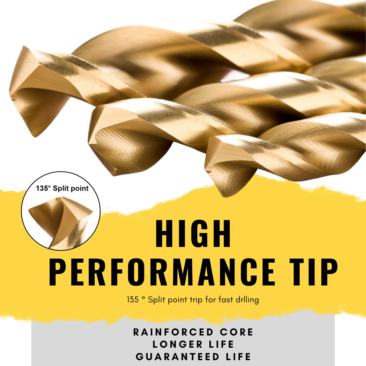 PRECISE 135 Split Point Twist drill bits manufactured to DIN 338 For fast, clean drilling. Gold drill bits have titanium finish and round straight shanks. Prevent walking, clear chips and particles faster. It is your ideal choice for DIY projects and household maintenance and repair.