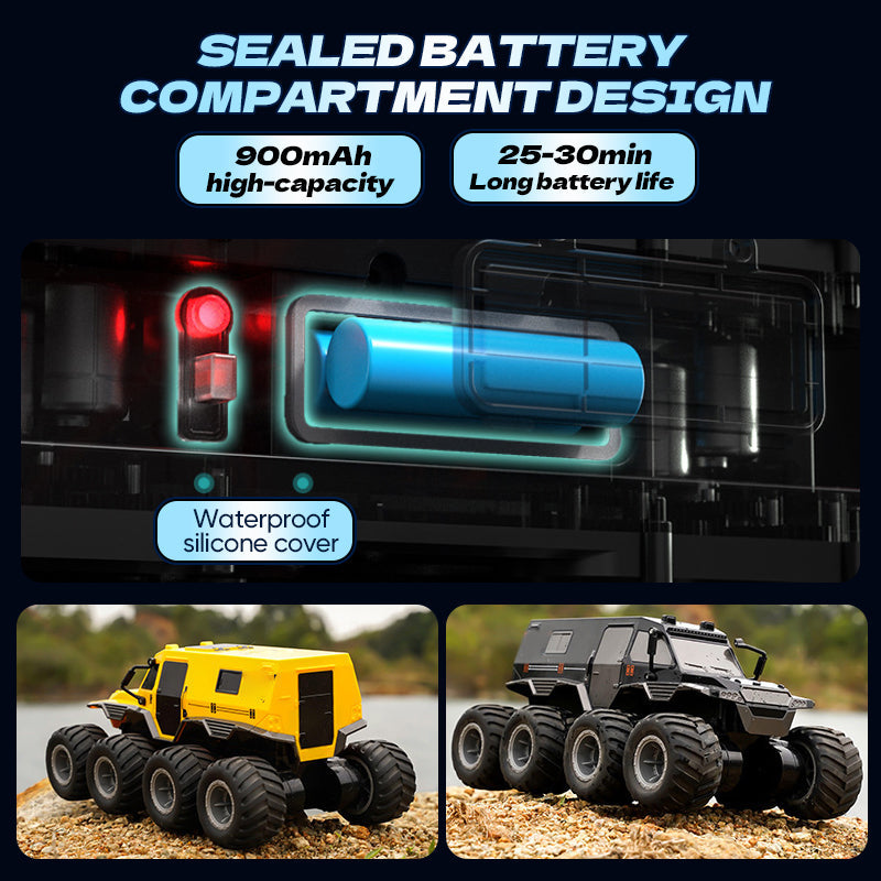Adapt to Various Terrains: 8WD off-road design allows the truck to smoothly drive on both land and water, easily climbing obstacles and navigating rough surfaces.