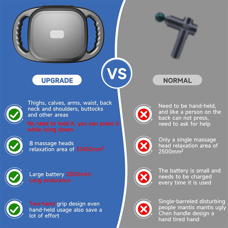 8 massage heads & unique handle design: This massage gun has 8 massage heads, which provide deeper massage and a larger massage area, which is equivalent to using eight single-head massage guns at the same time, greatly improving the massage efficiency. In addition, the handle of the massage gun also has an anti-slip and shock-absorbing design, making it easy to hold it to massage your legs, feet, waist and other parts.
