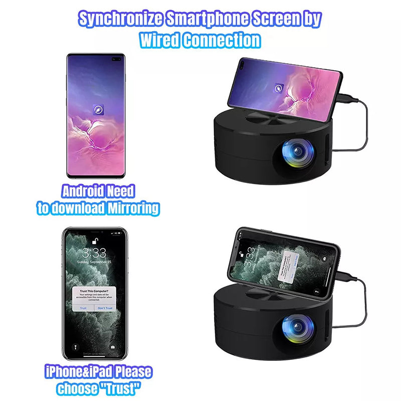 This video mini projector is equipped with multiple ports for easy using, including USB, DC micro IN, audio. Can mirroring your phone,tablet with IOS or android system,also support mirroring USB flash driver.