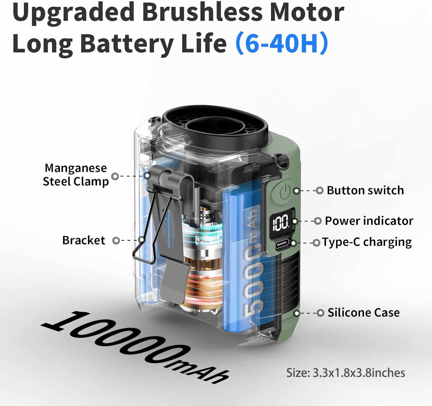 【Long Lasting Working Time】: With the same 10000 mAh battery, after upgrading the motor, the wind speed has increased by 15% without affecting the endurance. The minimum wind speed lasts for 8 hours, while the highest wind speed can last for up to 40 hours
