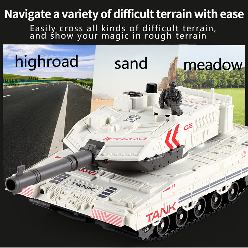 Durable and all-terrain capable: The tank is designed to conquer a variety of terrains such as high roads, sand, and meadows. It’s durable and ready for thrilling adventures, ensuring you can perform battle missions in different environments.