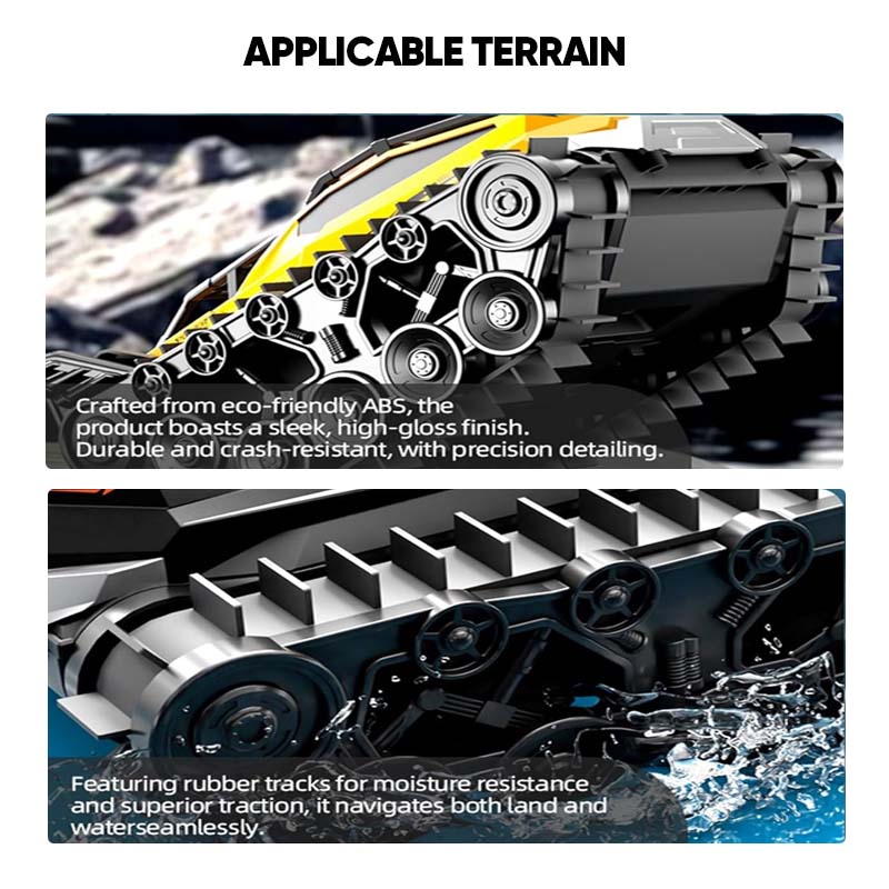 Sturdy and crash-resistant design: The tank is crafted from eco-friendly ABS materials, featuring a sleek, high-gloss finish and precision detailing. It is both durable and crash-resistant, allowing it to withstand bumps and impacts during rugged adventures. Whether you’re racing through the mountains or zooming through water, this vehicle will remain intact and perform flawlessly.