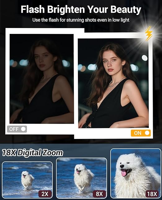 Effortlessly shoot stunning photos in any style, even beginners: So simple to use—anyone from kids to adults can capture great photos or videos with the press of a single button. The built-in soft fill light and beauty mode enhance your shots in any lighting, while 20 popular filters (vintage, landscape, beauty, sunset, b&w...) automatically match your scene—whether it's portraits, landscapes, or food—to make your images stand out. No editing needed.