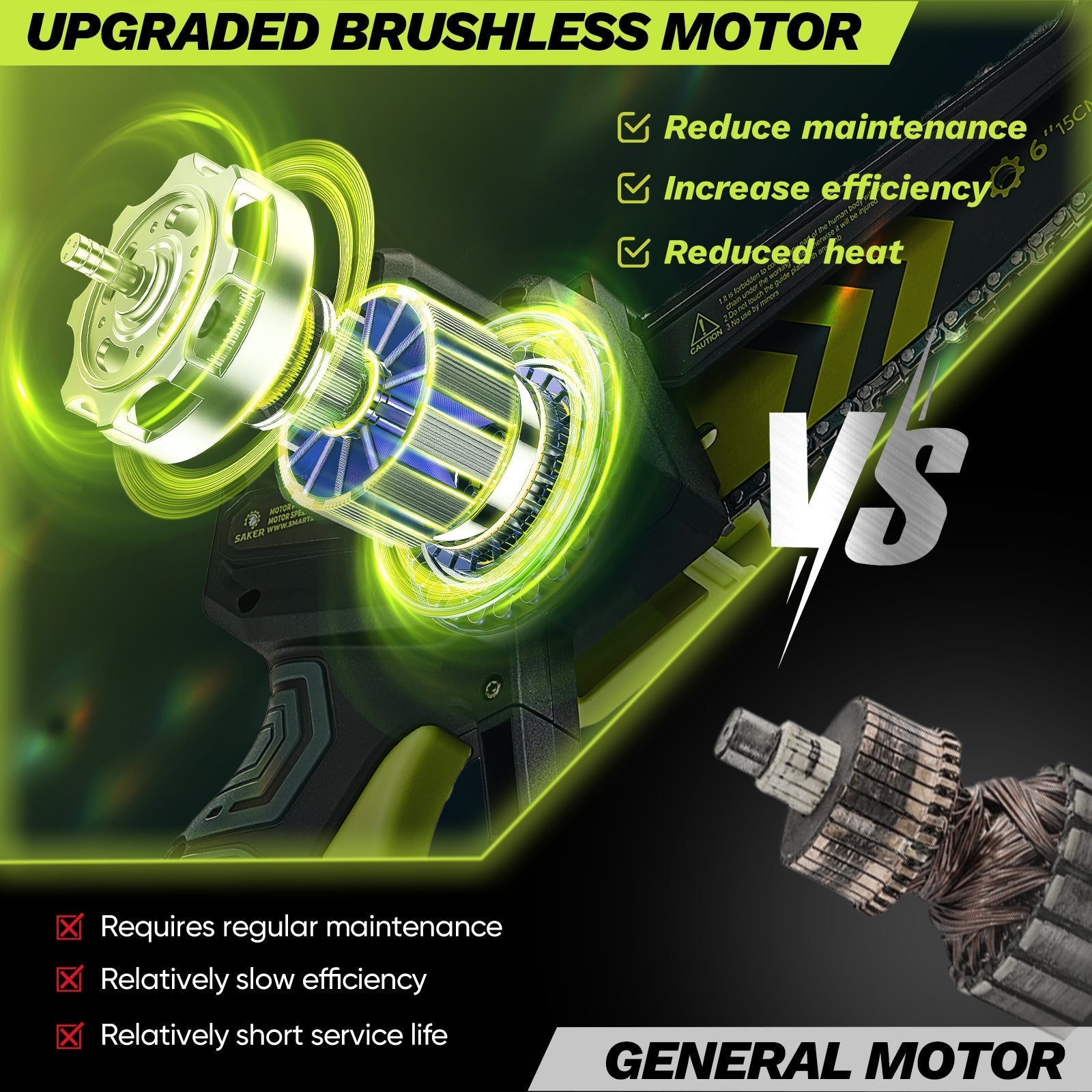 Newly Upgraded Brushless Motor: Equipped with a brushless 400W motor, the Saker pole saw delivers enhanced cutting power with a chain speed of up to 26.25 ft/s (8 m/s). Enjoy a 5 times longer service life, a 30% increase in power output, and a 50% improvement in cutting efficiency. Compared to regular chainsaws with brushed motors, the Saker brushless 6-inch (15.24 cm) long pole saw is more powerful and better suited to your trimming needs.