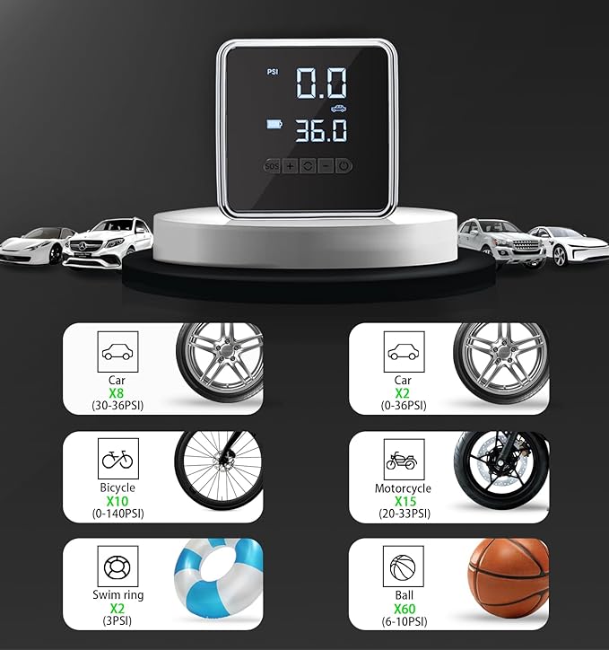 Fast inflation & memory function: This portable air compressor for car tires has a max pressure of 150 PSI, which can quickly inflate cars, motorcycles, bicycles, trucks, and RVs. It can inflate a standard car tire from 29 to 36 PSI in less than one minute. The smart air pump includes a memory function that automatically saves the preset pressure value after each use, eliminating the need for manual resetting.