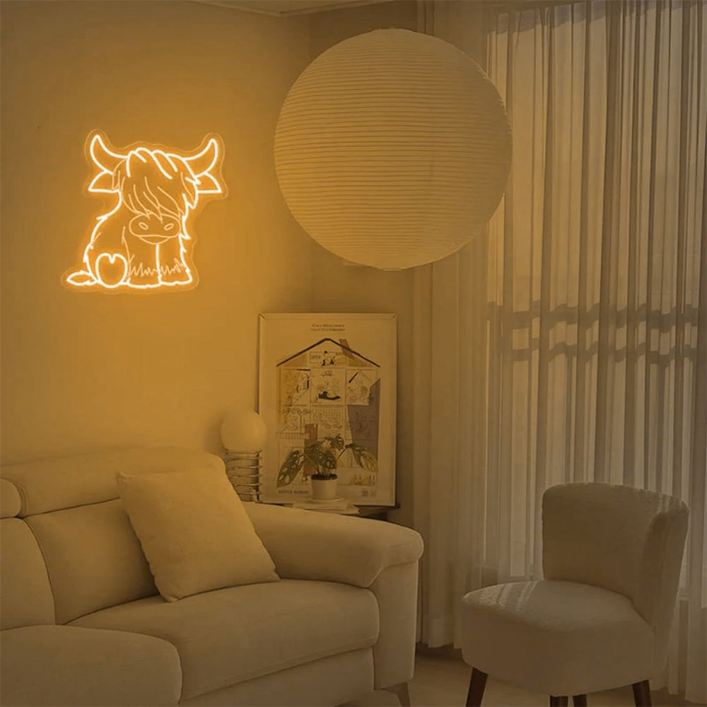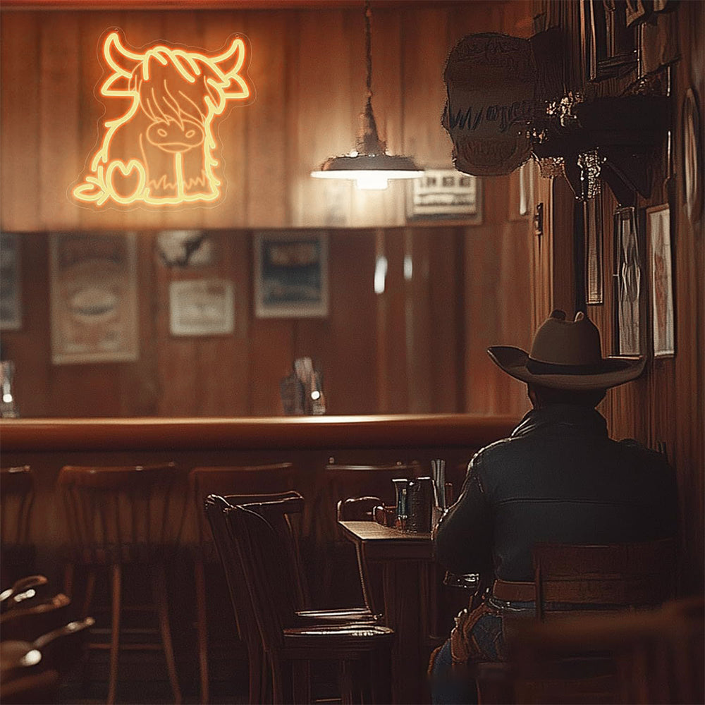 • Adorable design: This neon sign features an adorable Highland cow sitting in a relaxed pose, with a cute and whimsical style.