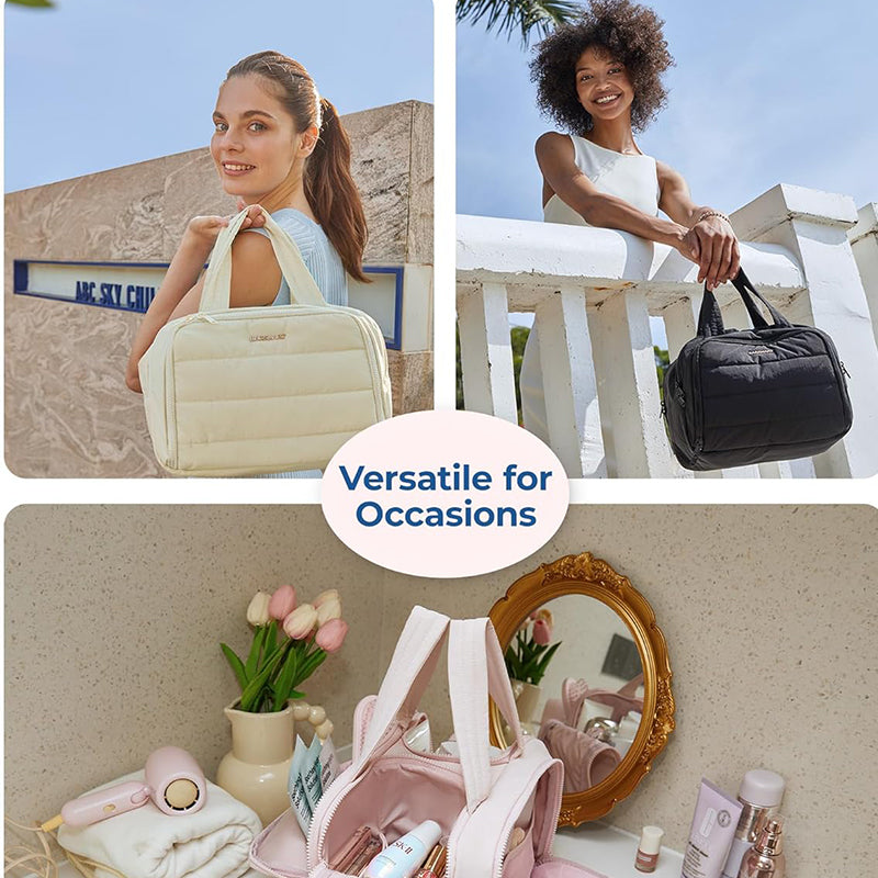Large capacity & organized storage: Measuring 30 × 21.2 × 18.5 cm (11.8 × 8.3 × 7.3 in), this spacious travel cosmetic bag features 4 independent compartments with elastic pockets and zippers, offering ample room for toiletries, shaving kits, and makeup essentials—all in one bag.