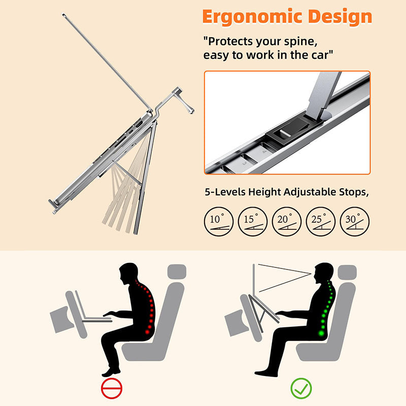 Height adjustable: The car laptop mount offers five height adjustment levels, allowing you to customize the table height based on personal comfort and ergonomic needs. Whether on short commutes or long-distance trips, it helps prevent strain on your neck and waist, providing a comfortable working experience in your vehicle.