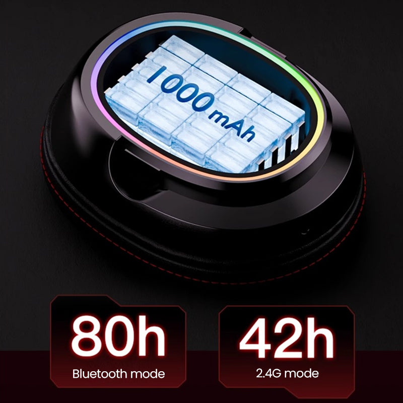 Long-lasting battery power: With a built-in 1000mAh battery, the headset delivers up to 80 hours of playback in Bluetooth mode and 42 hours in 2.4G mode. This extended battery life ensures stable performance for gaming, streaming, and daily use without frequent charging.