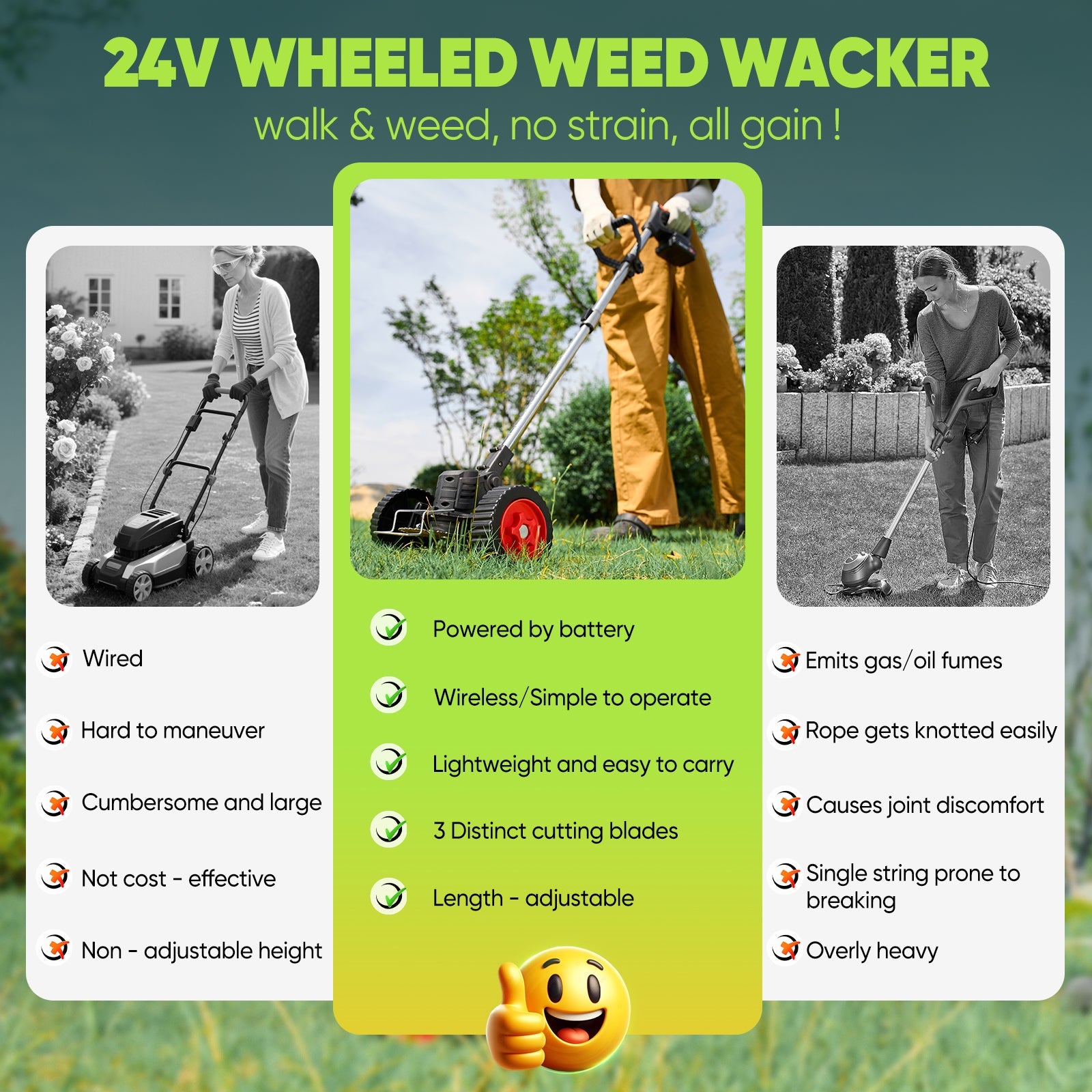 • 3 Types of Blades: The weed wacker comes with 3 types of blades: Plastic blades are suitable for cutting soft grass and other light vegetation. Stainless steel metal blades for cutting thick weeds and small bushes. Manganese steel circular saw blades for cutting thicker bushes and branches.