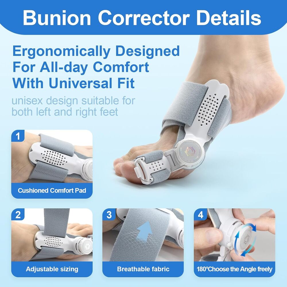 The 180° adjustable bunion corrector: Designed with a 180° adjustment range, the bunion corrector adapts to different bunion conditions. The easy-to-use magic band ensures a snug fit, stable support, and effective pain relief. A thickened bunion pad reduces friction and pressure on the joints, while the soft, breathable relief sleeve can be worn under socks and shoes for continuous correction anytime, anywhere.