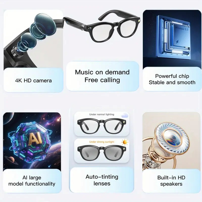Ai smart glasses with hd camera: Capture high-quality photos and videos with the 800W HD camera, featuring AI-powered object recognition and real-time feedback for enhanced work and study experiences.