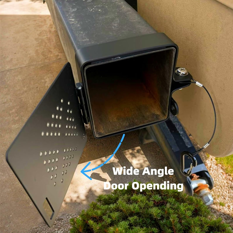 - Hinged access door with secure buckle: Equipped with a hinged aluminum door and integrated buckle for easy access to stored sewer hose without removing the entire cap - keeps contents safe and secure during travel. Rubber pads ensure more snug fit and helps to keep caps in place.