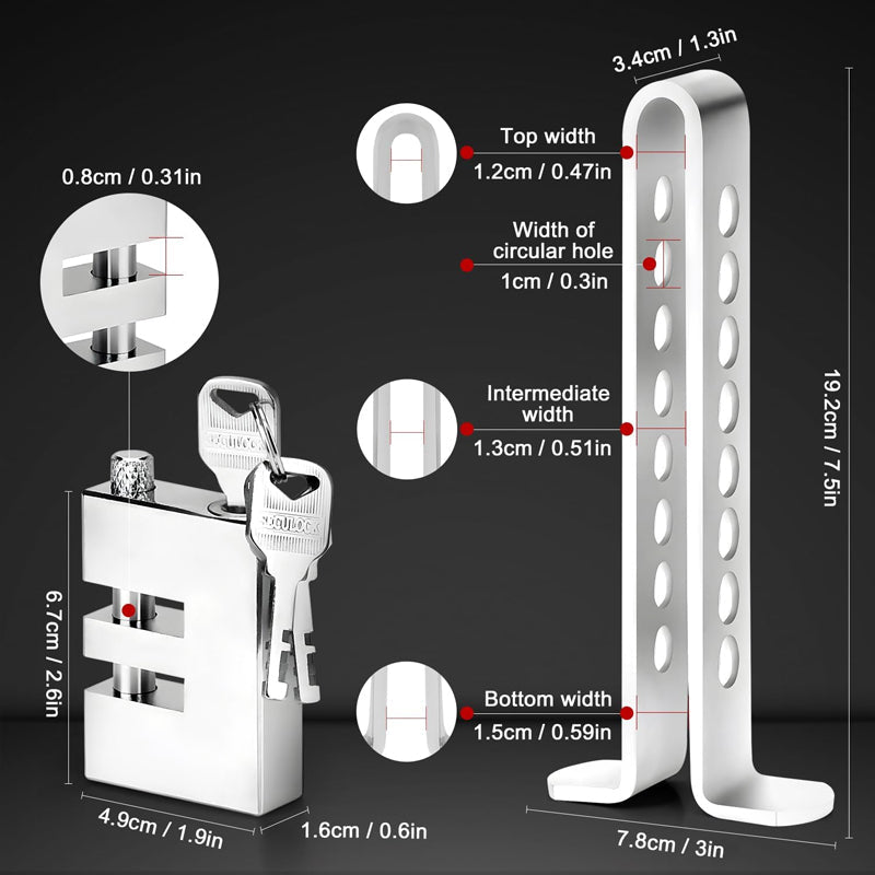 Package includes: 1 x pedal lock with 8 holes and 3 keys. Do not cut, cannot pry.