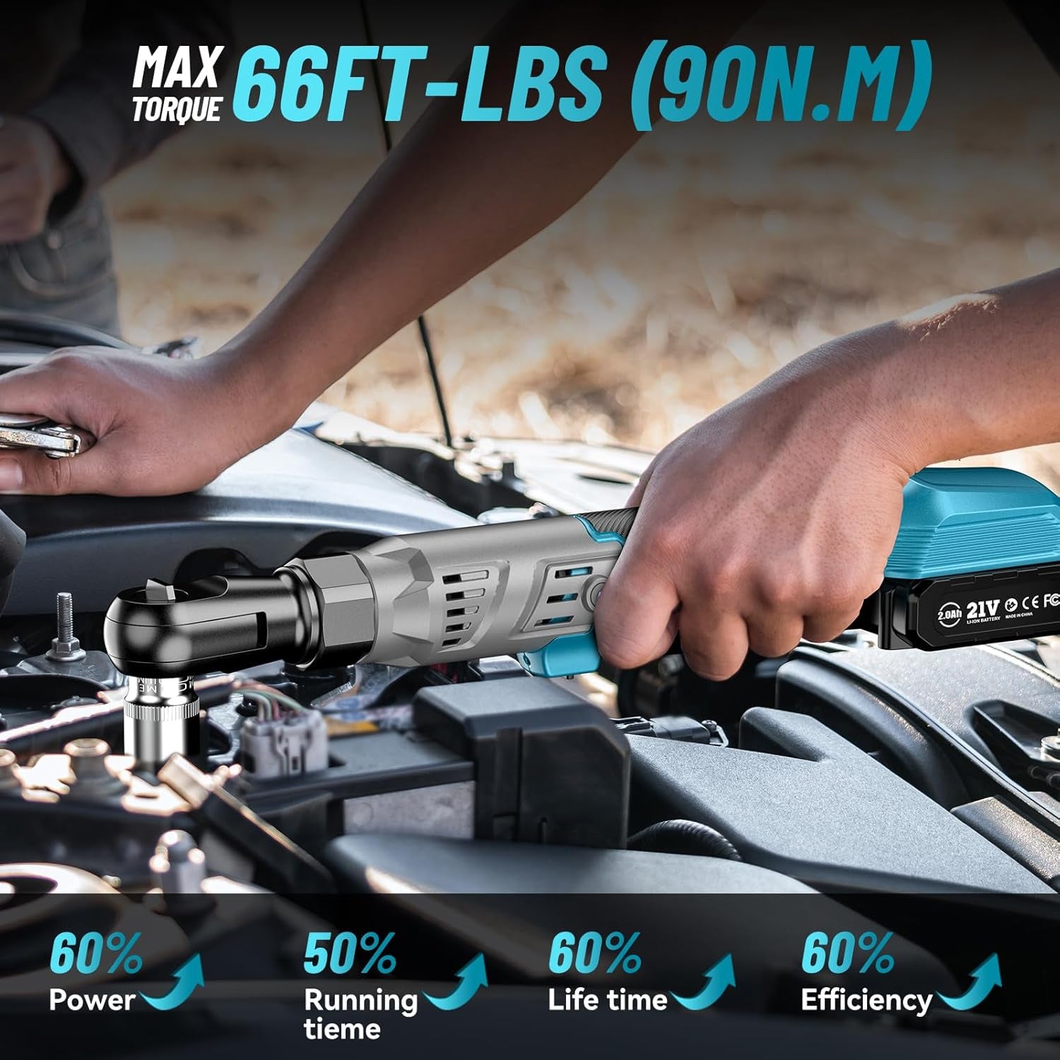 Powerful torque: The cordless ratchet wrench features bearings made from thicker steel, delivering powerful torque of 66FT-LBS/90Nm at 200 RPM. Ideal for loosening and tightening bolts and nuts, the 3/8'' cordless ratchet wrench effortlessly handles mechanical, automotive, and household repair tasks, catering to both light professionals and DIY enthusiasts.