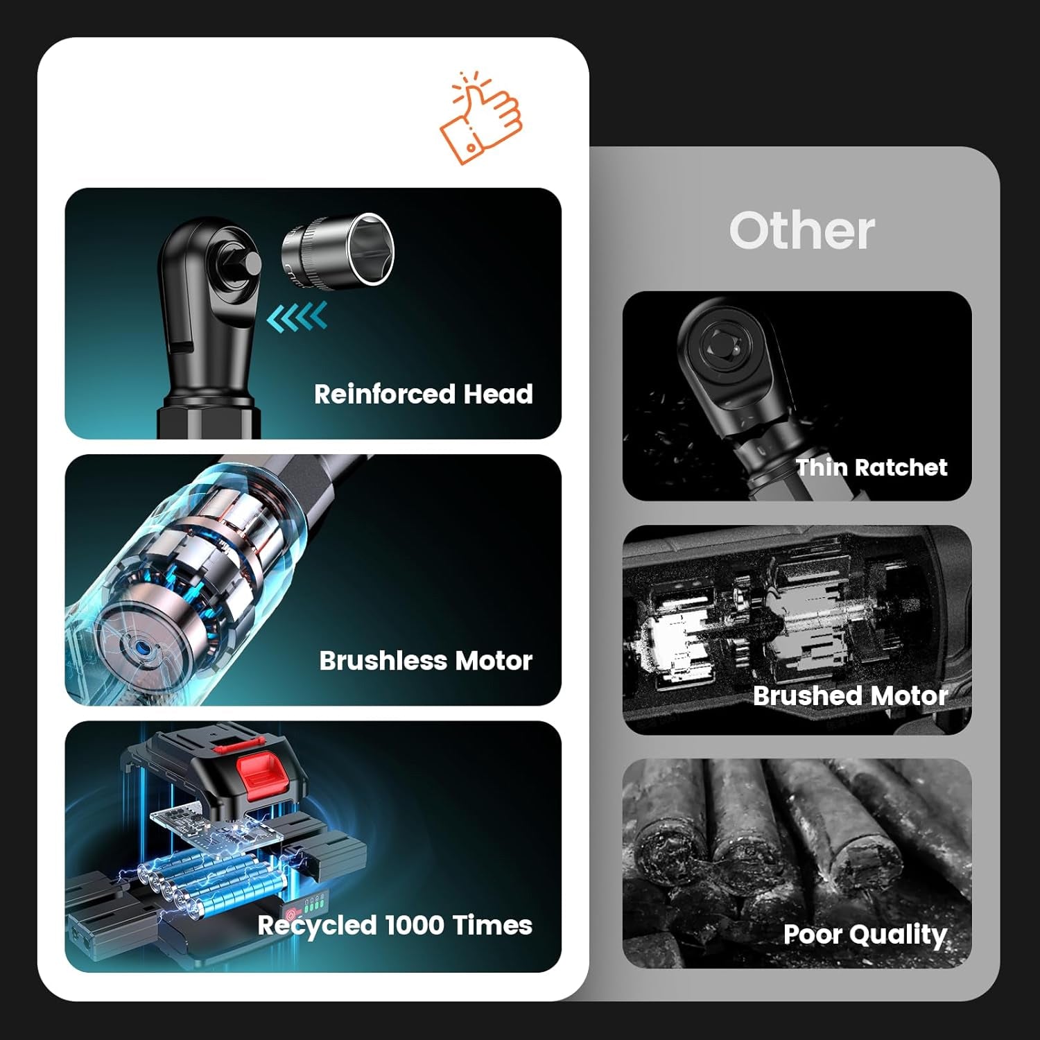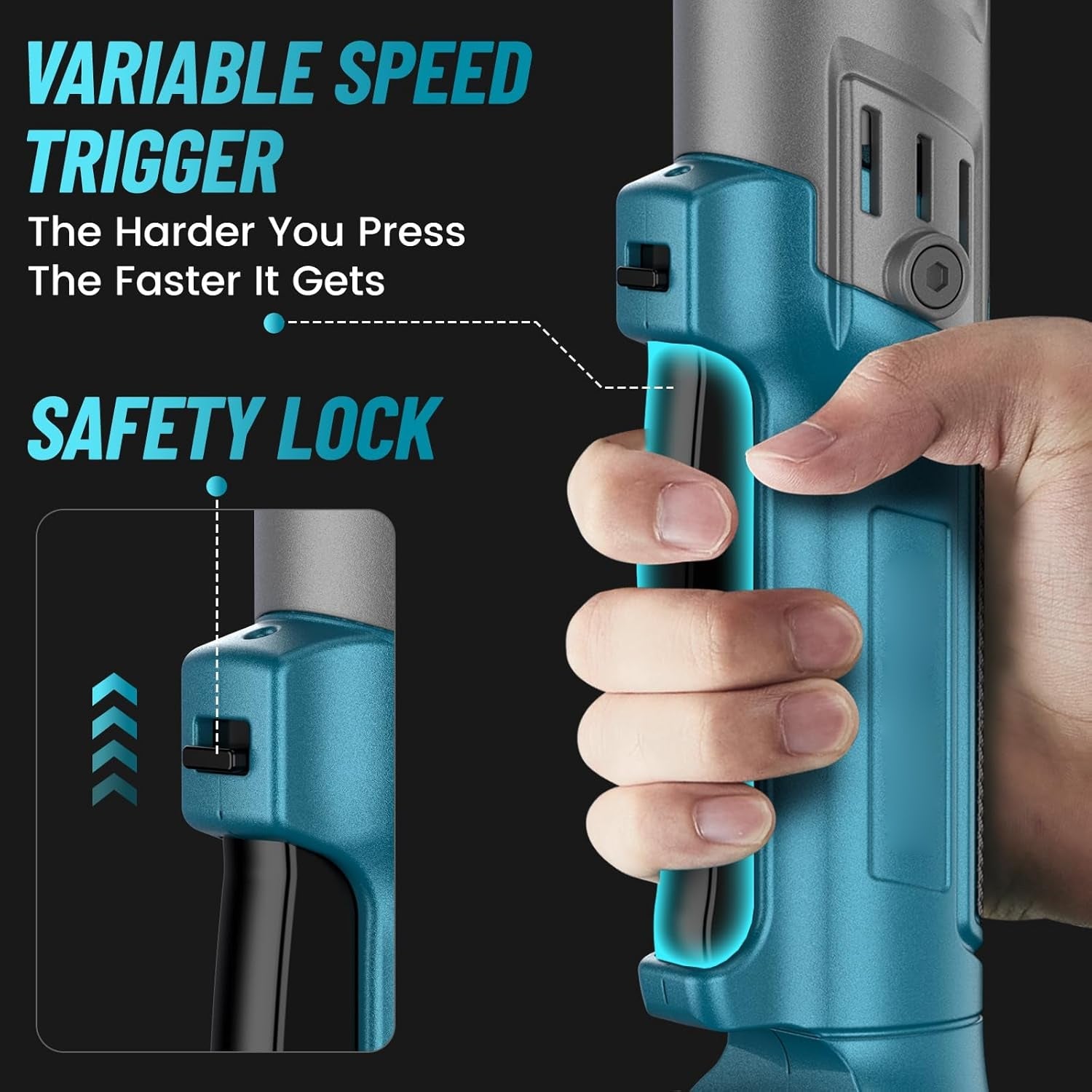 Brushless motor & speed settings: Brushless ratchet wrench motors are more efficient, longer-lasting, and generate less heat than brushed motors. They also allow more compact designs. Variable speed triggers and multiple speed settings allow better control for different tasks. The harder you push, the faster it gets.