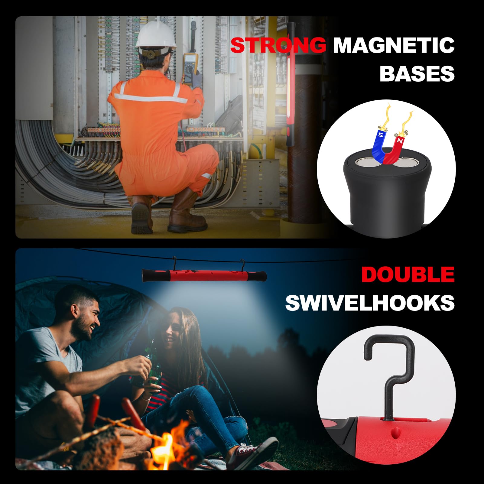 Dual strong magnets & swivel hooks: This magnetic LED light is equipped with a double-headed magnetic base that can be firmly attached under metal surfaces such as the body, hood, and can not be bumpy off, a 360° rotating body,a 180°rotating base, and 2 sturdy hidden hooks on both ends to direct the beam to where you need it most