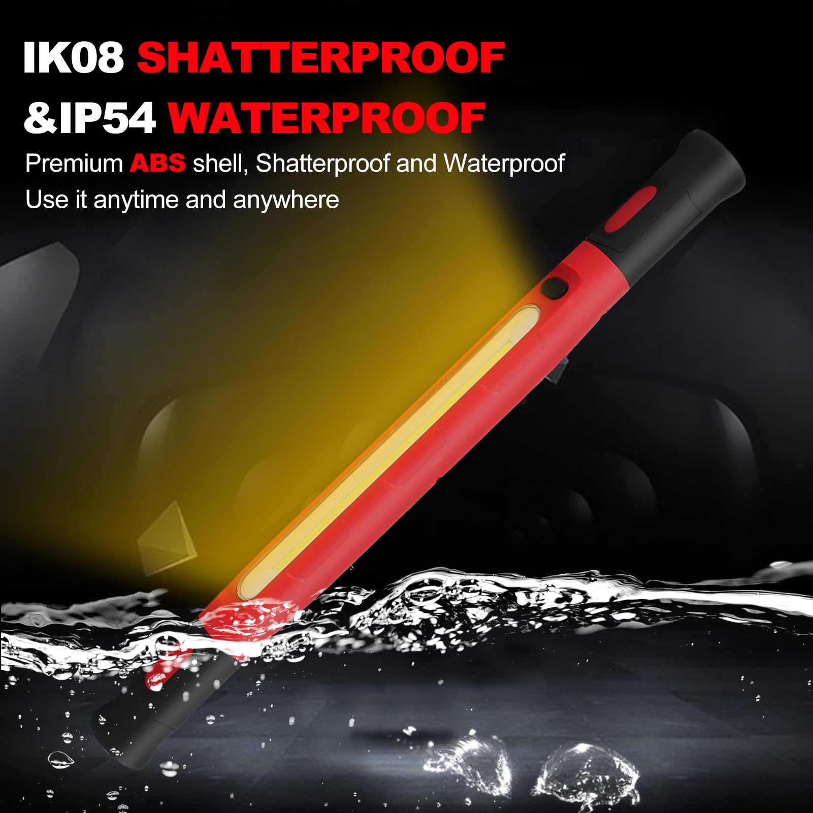 Great designed: This worklight is protected by hard rubber at both ends to ensure durability. Features IP54 waterproof rating, enhanced ABS housing made of military-grade materials. Passed an 8-foot drop test, intact. Well made and durableIt can effectively withstand shocks, drops and other unexpected situations, and protect internal lamps and electronic co. mponents from damage