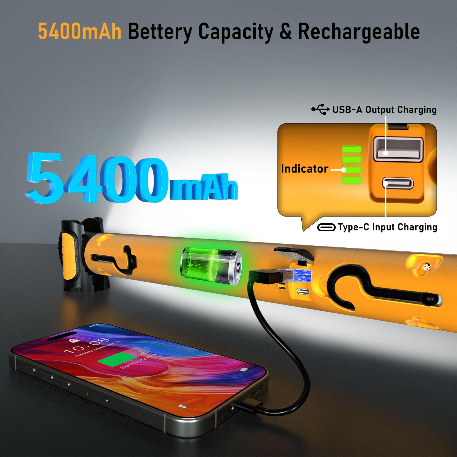 USB & type-C port: This underhood worklight has a 5400mAh capacity battery with Type-C input and USB output, and can be fully charged in just 3 hours. After full charge,it can run continuously for 4 hours at high brightness and 6 hours at low brightness. It also has a battery indicator to control the battery status in real time