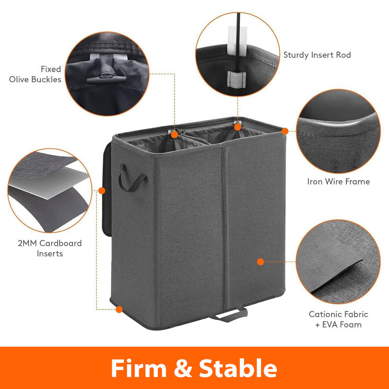 Two large compartments: With 2 large divided sections, you can easily separate darks and lights, clothing from linens, his and her items, or child and adult pieces. Two included laundry bags with handles fits onto the hamper firm and tight with drawstring stoppers. Use the handles to easily pull out the removable laundry bags with dirty laundry for wash.