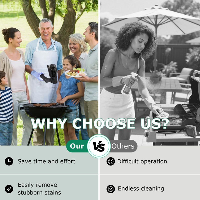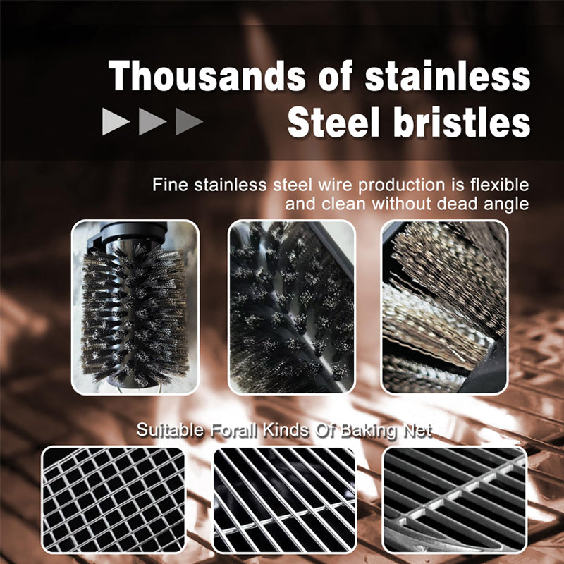 Efficient cleaning: Our grill brush delivers at least 3times faster grease removal efficiency than manual tools. The stainless steel bristles penetrate deep into grill grates while the scouring pad brush remaining gentle on porcelain coated surfaces, ensuring thorough cleaning without scratching.