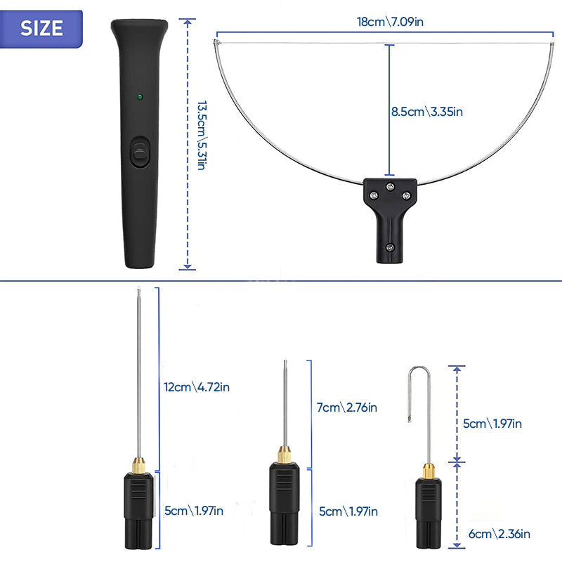3-in-1 styrofoam cutters: Cut or engrave foam with a complete tool set. This 3-in-1 foam cutter includes an 18W power adapter, 12cm and 7cm wand-style hot knives, an 18cm bow hot blade, replacement wire for the bow, and a cutter holder. Whether you are a DIY enthusiast, crafter, or artist, the three different cutting wands can meet your needs.